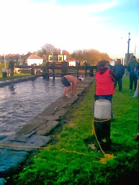 A crowd of about fifty people gathered at the site (with approximately two dozen others observing proceedings from the bridge) and all watched intently as six brave souls stripped off and eased, jumped and/or dived (!) into the cold waters in which , on the far side of the lock gates - mere meters from where the actual swim was taking place - lumps of ice could be spotted floating in the water and frost was visible on the grass! One of the swim organisers let it be known that , on Christmas Eve , at around lunch time, he had received a phone call from an RTE television reporter who wanted to verify the swim details re timimg, location etc and, when same was confirmed to the reporter, the swim organiser was told that an RTE TV crew would be on site between 11.30am and 12 Noon to record a few minutes of the activity for their news broadcast. And, as has happened before, no such RTE crew arrived. Self-censorship is still in operation, without a doubt.